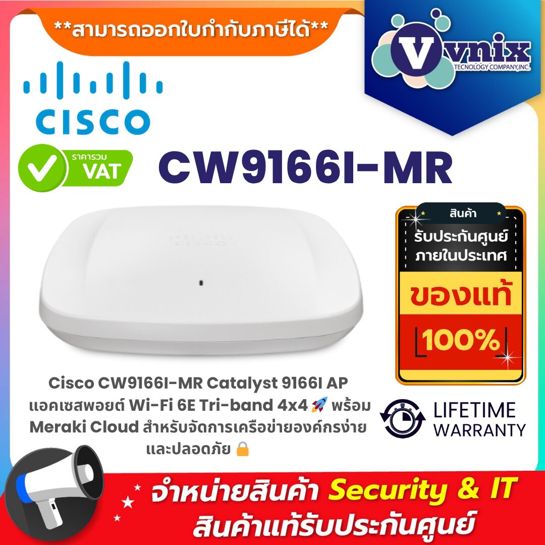 Cisco CW9166I-MR Catalyst 9166I AP คือ Access Point ระดับองค์กรที่ครบเครื่อง ทั้งความเร็วสูง ความเสถียร ความปลอดภัย และการจัดการง่ายผ่าน Meraki Cloud เหมาะสำหรับองค์กรทุกขนาดที่ต้องการเครือข่ายไร้สายที่ทันสมัยและพร้อมรองรับอนาคต 🌟