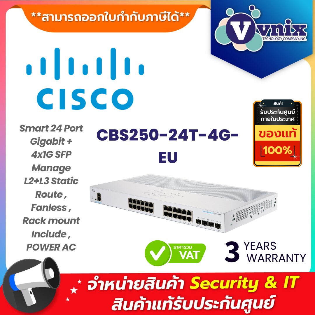 หากคุณกำลังมองหาสวิตซ์ที่มีประสิทธิภาพและง่ายต่อการจัดการสำหรับธุรกิจขนาดเล็กหรือการใช้งานในสำนักงานที่ต้องการการเชื่อมต่อที่เสถียรและมีคุณภาพ Cisco สวิตซ์รุ่น CBS250-24T-4G-EU คือตัวเลือกที่เหมาะสมสำหรับคุณ