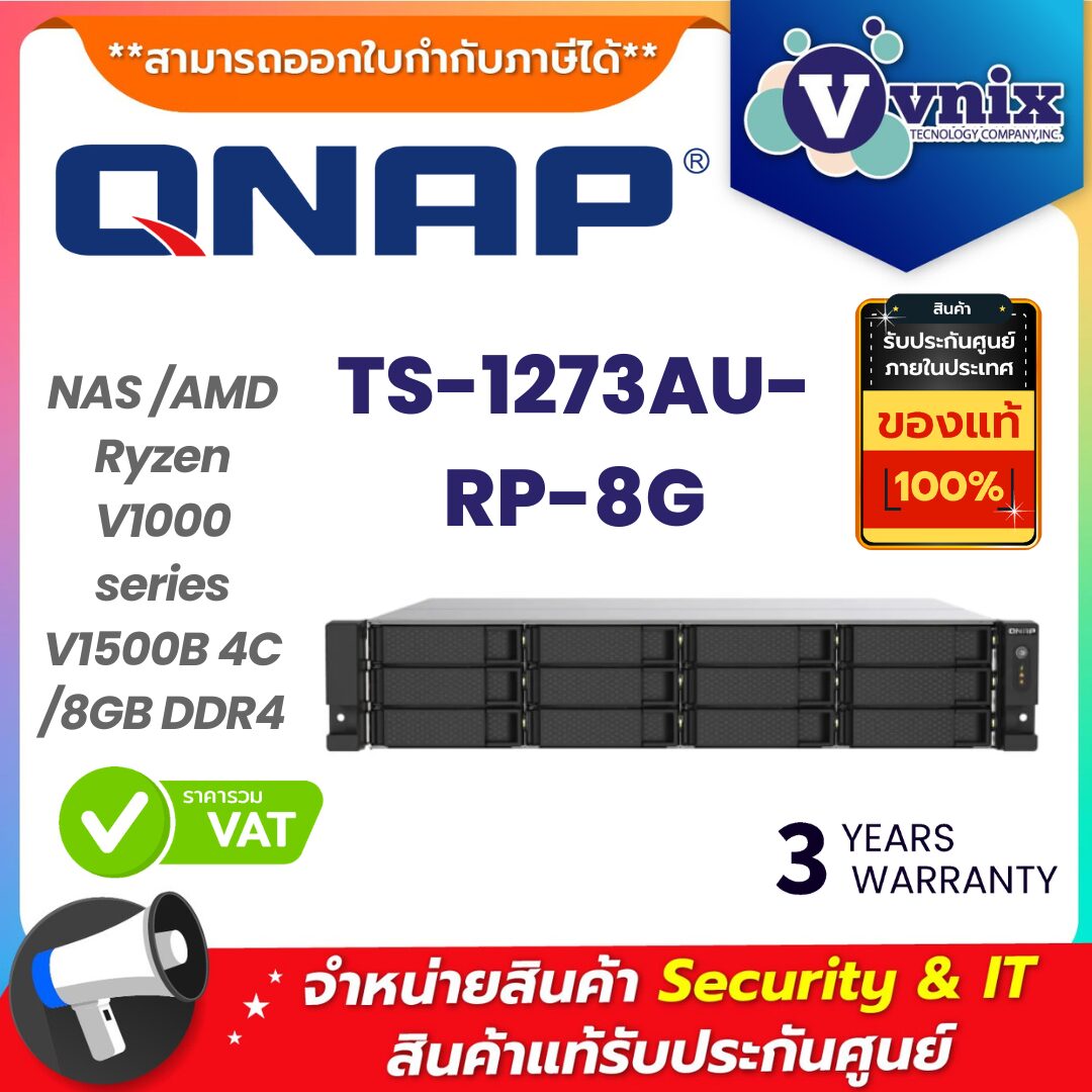 QNAP TS-1273AU-RP-8G เป็นอุปกรณ์ NAS แบบ Rackmount ที่ออกแบบมาเพื่อองค์กรธุรกิจที่ต้องการระบบจัดเก็บข้อมูลเครือข่ายที่มีประสิทธิภาพ ความปลอดภัย และรองรับการขยายในอนาคต ใช้พลังจาก ซีพียู AMD Ryzen V1500B แบบ 4-core/8-thread และมาพร้อมหน่วยความจำ DDR4 ขนาด 8GB (อัปเกรดได้สูงสุด 64GB) ที่เหมาะสำหรับงาน Backup, Virtualization, Surveillance และ File Sharing ภายในองค์กรที่มีผู้ใช้งานหลายราย